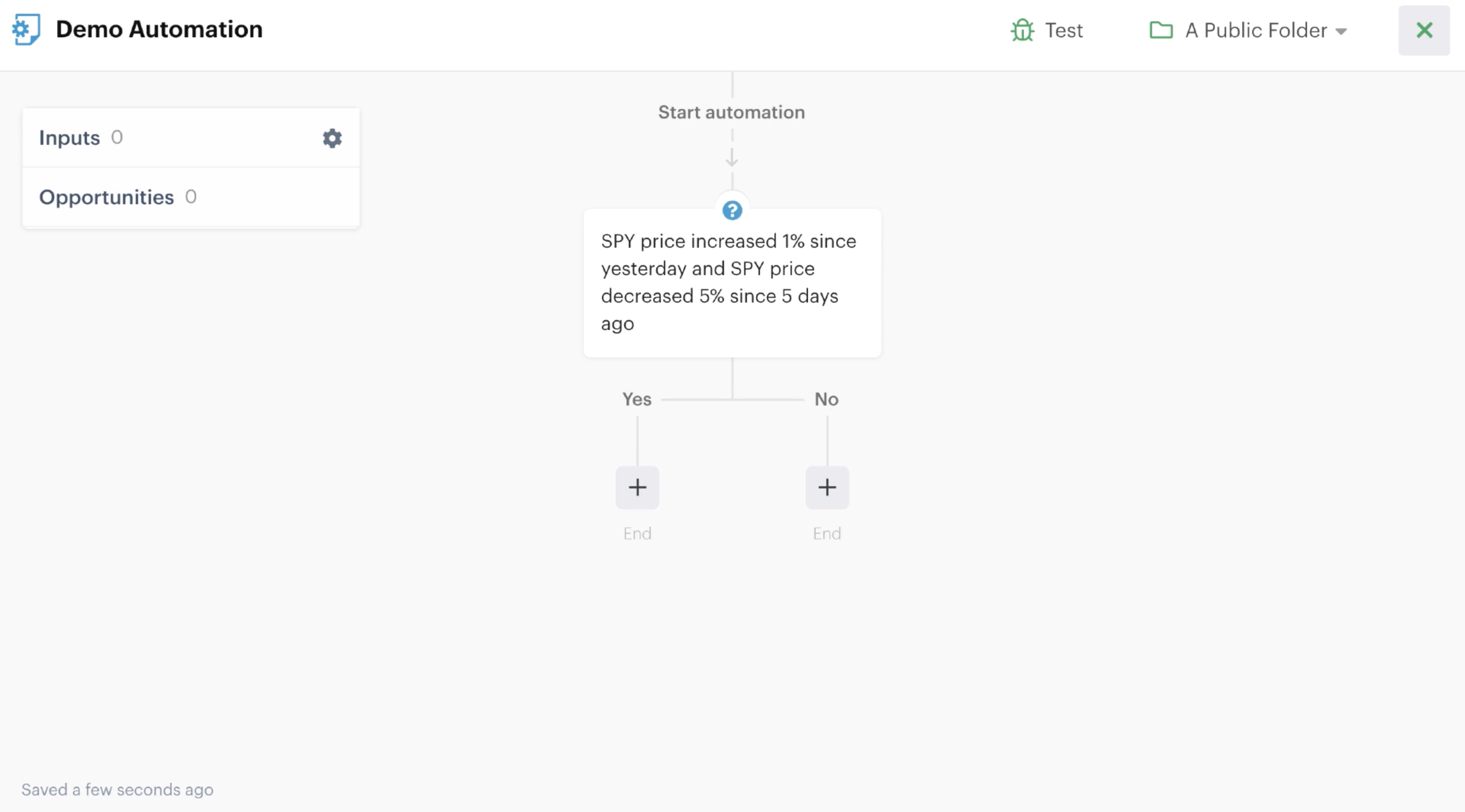 The decision action checks if a security’s price has increased or decreased by a certain amount over a defined period. You can even check multiple price changes over different time periods before proceeding through the automation.