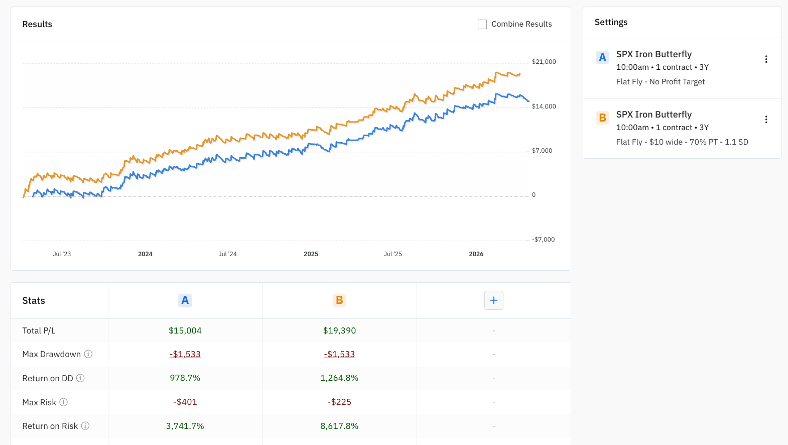 Here’s a look at the 0 DTE SPX iron butterfly strategy with no exit criteria. Adding exit options to close the trade with a 70% profit target increases the total P/L by 29%: