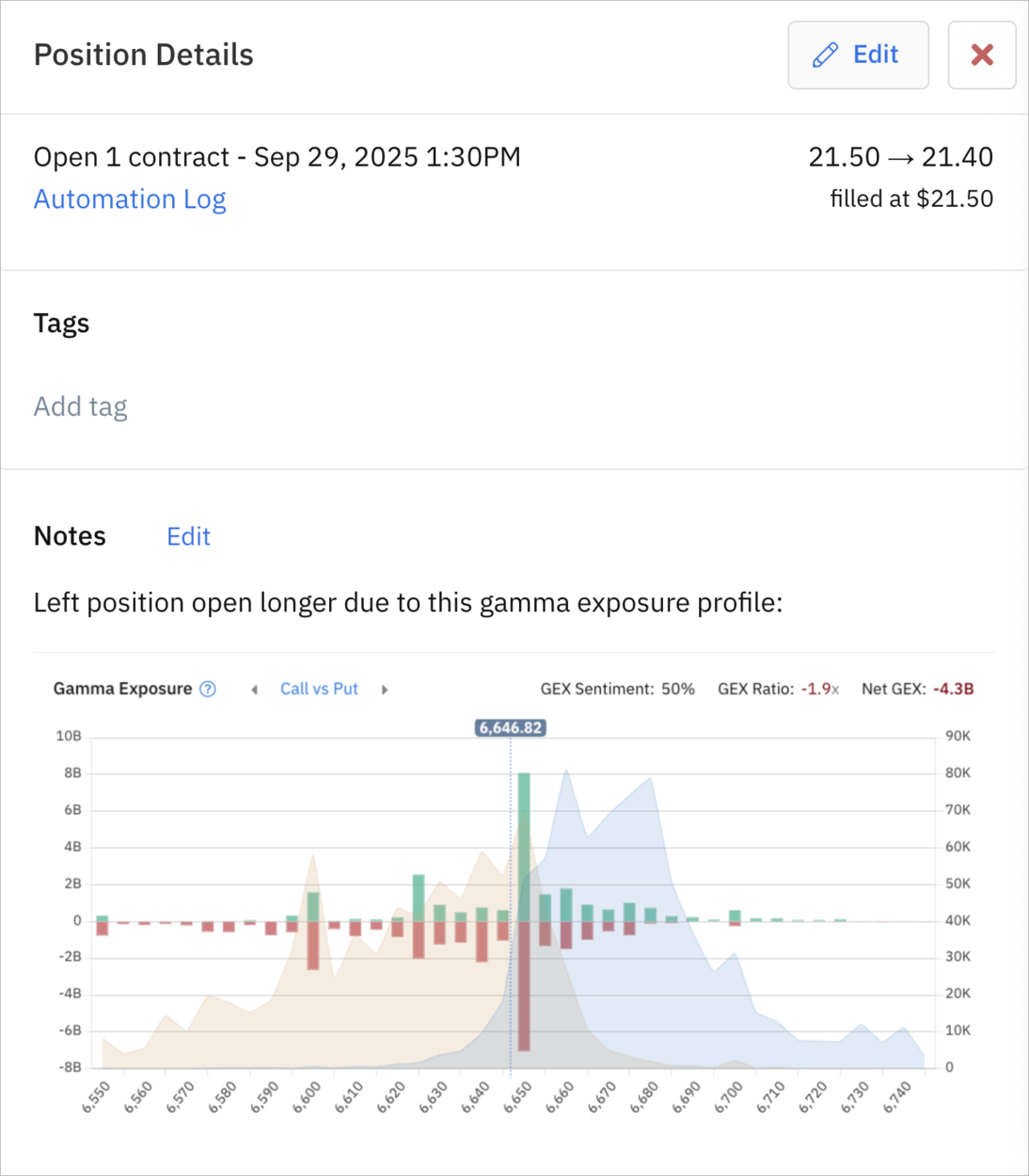 As part of this release, we added additional functionality around Gamma Exposure trading. If you're not familiar with GEX based trading, you may want check out this new Youtube playlist. While we are just in the beginning stages of experimenting with how we can combine GEX trading with automation, we see an opportunity for the additional information GEX provides to improve our overall results as options traders.
