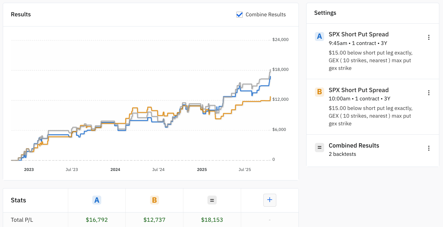 Here is an example GEX backtest that trades a short put spread and produces solid returns with a low drawdown. It looks for an opportunity to trade when the strike with the maximum put GEX is 2x more than any other strike and the reward/risk ratio available is 50% or higher. The backtest combines the results of looking for the trade at 9:45am and 10:00am so it could easily be automated to run a scanner with time period of 9:45am to 10:00am (or later).